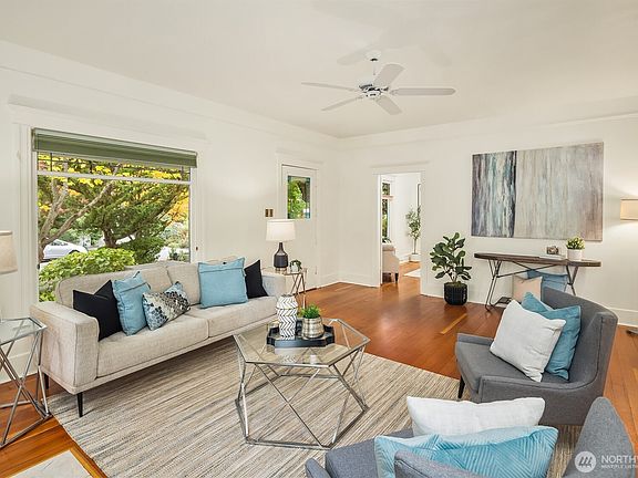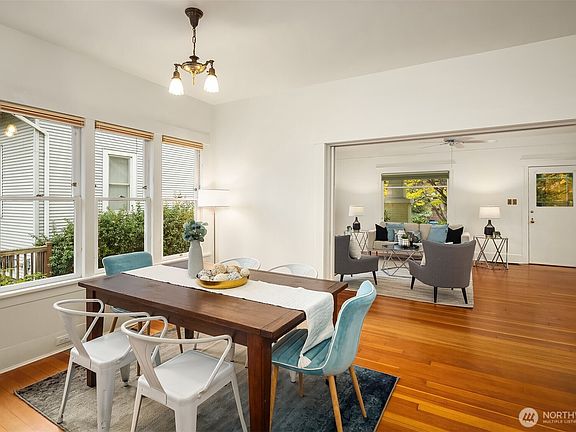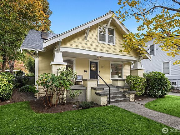 Charming and inviting Green Lake Craftsman just blocks from Tangletown and the lake! Set on a spacious lot with mature landscaping, this home blends timeless character with modern updates. Fresh interior paint, updated kitchen, and improved electrical and plumbing systems offer comfort and peace of mind. Sunlight fills the warm wood-floored main level featuring a cozy dining room, two bedrooms, and a full bath. Upstairs includes two additional bedrooms, a bonus den or sitting area, and another full bath. The finished basement adds a recreation room, a half bath, a laundry, and ample storage. Solar panels enhance energy efficiency. Enjoy the private patio, detached garage, alley access, and off-street parking. Pre-inspected