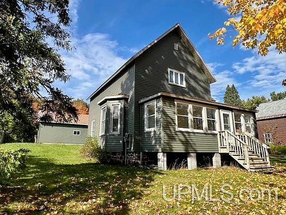 Spacious historic Calumet home with great curb appeal and a wraparound porch. Updates include roof, siding, and a 26x30 detached garage. Features a fully remodeled kitchen with quality wood cabinetry, hardwood floors, and updated windows. Main level has a parlor, dining room, and full bath. Upstairs offers four bedrooms, a second bath, and front and rear stairways. A nice blend of historic charm and practical updates near schools, parks, and downtown.