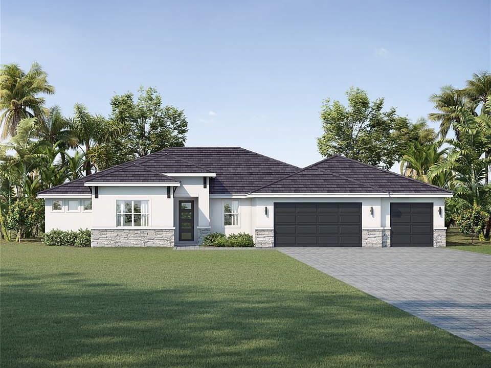 One or more photo(s) has been virtually staged. Under Construction. November 2025 estimated completion date! Modern Luxury Meets Peaceful Living! Get ready to fall in love with a brand-new home that perfectly balances elegance, comfort, and space. Currently under construction, this 4-bedroom, 3-bathroom modern residence sits on a 1-acre lot with no wetlands, surrounded by natural beauty and everyday convenience. Step through the front door into an open-concept floorplan that invites connection and light. The designer kitchen will feature 42” solid wood cabinetry, quartz waterfall island & countertops, a double wall oven, glass cooktop, tile backsplash, pendant lights, and a spacious pantry...all opening to the living and dining areas for effortless entertaining. Sliding glass doors lead to a covered lanai, pre-plumbed for an outdoor kitchen, making it the perfect space to relax and enjoy your peaceful, tree-lined backyard. The private primary suite is a true retreat, complete with its own sitting area overlooking the backyard, a huge walk-in closet, and a spa-style bath with a double quartz vanity and luxurious walk-in shower. Bedroom 2 offers a private bathroom, ideal for guests or an in-law suite, while Bedrooms 3 and 4 are tucked quietly in the back of the home and share a thoughtfully designed bathroom. Work from home? The dedicated office provides privacy and focus, while the energy-efficient insulation, LED lighting, and Energy Star® appliances keep your home comfortable and cost-effective year-round. The 4-car garage offers plenty of room for vehicles, storage, or your golf cart. With tile floors throughout, an irrigation system, black matte hardware, and a paver driveway, this home boasts low maintenance living without sacrificing style! Best of all....you’ll have peace of mind with the builder’s warranty, ensuring your investment is protected for years to come. Located in a sought-after community with an A-rated school, 18-hole golf course, and amenities for every lifestyle, including pickleball courts, playgrounds, dog parks, hiking trails, and sports fields, you’ll experience a perfect blend of recreation and relaxation. Conveniently located within 30 minutes to beaches, theme parks and downtown Orlando!