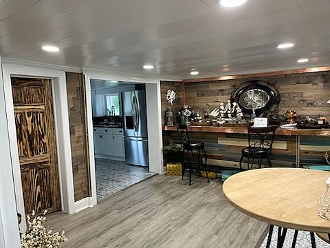 The Livingroom is filled with natural light thanks to many windows and a custom made Bar which is great for entertaining.