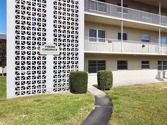 Enjoy bright, sunny Florida living in this beautifully updated 55+ corner condo at Tyrone Gardens II! This 1,025 sq. ft. second-floor unit offers 2 bedrooms and 2 updated bathrooms, including an en-suite with generous closet space in the primary bedroom. Both bedrooms are spacious and filled with natural light. The galley-style kitchen provides ample storage and counter space for all your cooking needs. A versatile bonus room overlooks the peaceful community courtyard—perfect for a home office, reading area, or exercise space. The beautifully maintained courtyard features a grill and shaded seating areas, ideal for outdoor dining, gatherings, or simply relaxing in the Florida sunshine. Additional conveniences include a laundry room, elevator access, a garbage chute on the second floor, a storage room with individual storage closets for each unit, and an assigned covered carport. The building was recently re-roofed, and there are no pending HOA assessments, offering peace of mind for the new owner. HOA fees include water, sewer, trash, and exterior maintenance for easy, worry-free living. Located in a non-flood zone for extra security and value. Conveniently located just one minute drive to the Tyrone Gardens Shopping Mall, home to Winn-Dixie, Gianni’s Pizza, an ice cream shop, and Crunch Fitness. Nearby, the J.W. Cate Recreation Center offers a community pool, park, sports complex, and playground, perfect for active lifestyles and social gatherings. Beautiful beaches are only 10–15 minutes away, and Downtown St. Petersburg is a 15-minute drive. Public transportation is easily accessible, with a bus line just steps from your door. This floor plan is highly sought-after, featuring large windows on three sides that fill the space with natural light. Contact the agent today to schedule your showing and experience the best of St. Petersburg living!