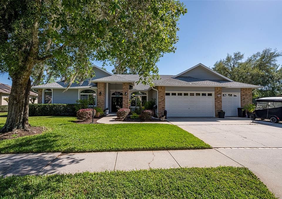 Welcome home to your Florida sanctuary, where sunny days are perfect for golfing, beach lounging, or enjoying your own backyard oasis. This spacious 4-bedroom, 2-full and 2-half-bath pool home with 3 car garage is nestled on nearly a half-acre lot at the end of a quiet cul-de-sac of custom homes. Enjoy mature landscaping and lush oak trees with views of the 16th hole of Lake Bernadette's public golf course. Upon entry, the formal living room offers expansive sliding doors overlooking the inviting pool and heated spa. Split formal dining and separate living room offer ample space for entertaining and relaxation. The custom pool and spill over spa in the screened lanai offer large bar for eating and plenty of covered area with fans for entertaining. Plumbed with gas for grilling and outdoor half bath, family and friends will enjoy gathering. The kitchen boasts stainless steel appliances, gas range, granite countertops, and loads of modern bright cabinetry with a walk-in pantry. The chef of your home will love the ample counter space, eat in bar, dinette and views of the pool and surroundings as they prepare any meal. New panoramic windows flood the adjoining family room with natural light and stunning views. Custom built in shelving flank the gas fireplace for cozy cooler evenings. This split floorplan offers perfect privacy with the 2 secondary bedrooms sharing a newly updated bathroom with glass walk-in shower. The 3rd bedroom has easy access to the beautifully appointed half bath. The private primary suite offers direct pool access and a new spa-like ensuite bathroom with his-and-hers closets, dual sinks, a sunken tub, and a glass walk-in shower. Every detail, from the custom low-flow toilets to the exquisite stone finishes in the additional bathrooms, reflects meticulous craftsmanship. With low HOA fees which include trash and mailbox, no CDD and affordable access to the Golf Course, clubhouse, 2 community pools, pickle ball, tennis and more, this exquisite home with a 1 Year Home Warranty will not last. Call today and make this your home tomorrow. Bedroom Closet Type: Walk-in Closet (Primary Bedroom).