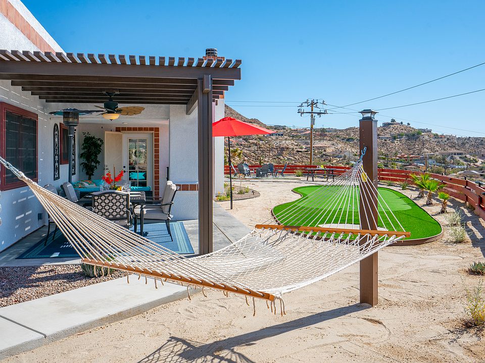 Welcome to your serene desert oasis at 57263 Farrelo Road in Yucca Valley, CA! This charming single-story home boasts 3 spacious bedrooms and 2 modern bathrooms, offering a perfect blend of comfort and style in a tranquil desert setting. Key Features: - Open-Concept Living: The bright and airy living area features high ceilings, large windows, and an open floor plan, creating a welcoming space for relaxation and entertainment. - Gourmet Kitchen: Equipped with stainless steel appliances, ample counter space, and plenty of cabinetry, the kitchen is perfect for culinary enthusiasts. Master Suite: The master bedroom includes an en-suite bathroom with a luxurious soaking tub, separate shower, and dual vanities. - Spacious Bedrooms: Two additional bedrooms provide plenty of space for family, guests, or a home office. - Modern Amenities: Central heating and air conditioning ensure year-round comfort, while an attached two-car garage offers convenience and storage space. - Outdoor Living: The expansive backyard features a covered patio, ideal for outdoor dining and enjoying the stunning desert sunsets. The landscaped yard includes native plants and a private setting perfect for relaxation. - Mini-Golf Course: Enjoy hours of fun and entertainment with your very own private mini-golf course, perfect for family gatherings or casual play. - Hot Tub Retreat: Unwind and rejuvenate in the outdoor hot tub, providing a luxurious escape right at home. - Prime Location: Nestled in a quiet neighborhood, this home is just minutes away from Joshua Tree National Park, local shops, dining, and entertainment options in Yucca Valley. Renters pay for all utility, including leasing payment to solar