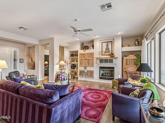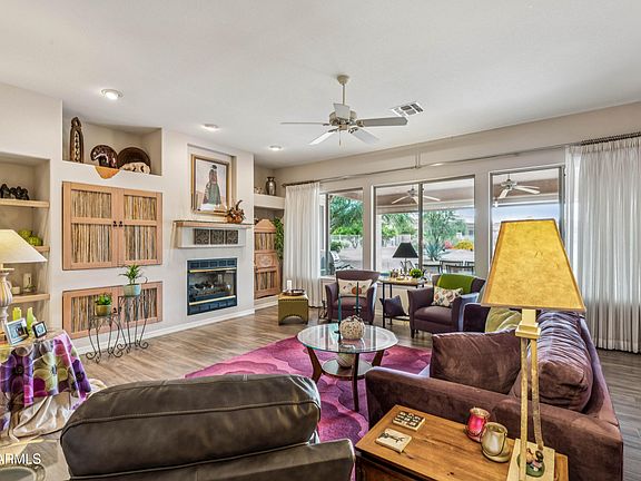 Bright and inviting, this 2,300 sq. ft. Cottonwood model features an open layout with a wall of windows filling the living room, kitchen, and primary suite with natural light. The kitchen offers granite counter tops, stainless appliances, soft-close drawers, and pull-outs. Includes 3 bedrooms, 2 baths, and a versatile hobby/office/bonus room with extra storage. The oversized 2½-car garage has abundant cabinetry. The primary suite includes a spacious sitting area. Updates include exterior paint (2023) and a new roof (2022). . Enjoy outdoor living on the large covered patio. Live the best of active adult living with top-notch amenities, public golf, and on-site dining nestled at the base of the majestic Superstition Mountains.
