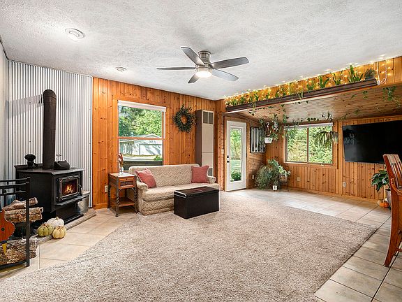Tall pines offering privacyOverhead doorWood stoveCeiling fanWarm and invitingGenerator hook-upMain floor laundry