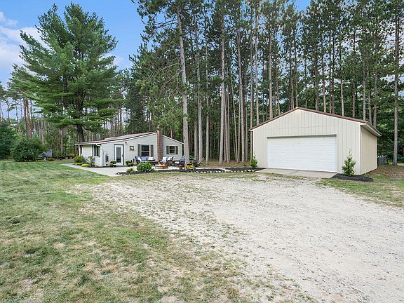 Escape the hustle with this cozy 2-bedroom ranch, and two spacious outbuildings, nestled on 5 partially wooded acres in Newaygo County. Towering tall pines offering privacy and an 'up north' feel. This warm and inviting 2-bedroom, 1 full bath home is ready to move into. Living room with wood stove. Ceramic tile entry. Kitchen includes all appliances and ceramic tile flooring. Main floor laundry. 24x32 detached garage with electric and overhead door and a 24x36 insulated stick-built outbuilding with electric, generator hook-up and overhead door. 12x16 shed fully insulated with electric and ceiling fan. Ideal for workshops and storage. Plenty of room for tools, toys and projects. This property offers a mix of open space and wooded privacy. High speed fiber optic internet. Check out this beautiful property today!