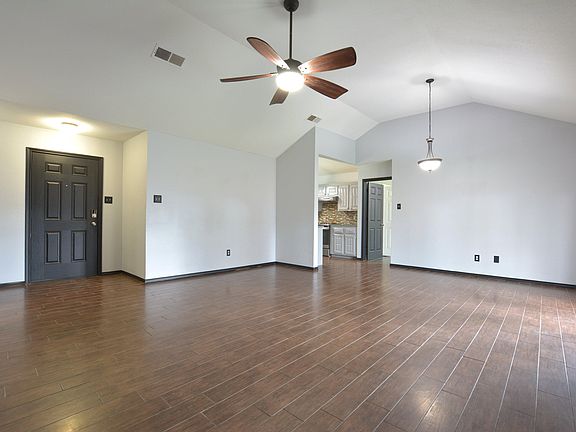 Cozy fireplaceHigh ceilingsGlass tile backsplashWell-kept landscapingWelcoming front pergolaBeautiful wood-look ceramic tile