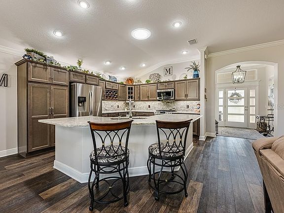 Seller may consider buyer concessions if made in an offer ~ Stunning Upgraded Home in The Village of Monarch – A Must-See! Welcome to your dream home in the highly desirable Village of Monarch! This beautifully updated and meticulously maintained residence offers the perfect blend of elegance, comfort, and functionality – truly a one-of-a-kind find in The Villages. Step inside and immediately notice the attention to detail: custom door and window casings, stunning crown moldings, and tile floors throughout that provide both beauty and durability. The open-concept living area flows seamlessly into the chef’s kitchen, complete with high-end finishes and designed for entertaining and everyday comfort. One of the true highlights of this home is the expansive 28x12 fully enclosed Florida room, featuring tranquil views of the pond and Riverbend Recreation Facility. Outfitted with new power roller shades, this space offers the perfect balance of privacy and natural light, making it ideal for year-round relaxation. Designed with a three-way split floorplan, the home offers optimal privacy and versatility. The spacious primary suite boasts a tray ceiling, water views, and a luxurious en suite bathroom with double sink vanity, a large tiled walk-in shower, walk-in closet, and its own dedicated tankless water heater. The second bedroom is bright and welcoming with bay windows that fill the room with natural light and also includes its own private en suite bath—perfect for guests or extended family. The third bedroom, located on the opposite side of the home, serves as an ideal guest suite, office, or flex space to suit your needs. And there’s more—this home features one of the largest garages in the area at 37x24 ft, offering plenty of space for vehicles, storage, and of course, your golf cart! Step outside and enjoy the oversized patio overlooking the serene pond and recreation facilities—perfect for evening sunsets or entertaining friends. There's even room to add a private pool if desired. This modified version of the popular Dove Model is loaded with upgrades and custom touches throughout. Don't miss your opportunity to own this unique, move-in ready home—schedule your private tour today!