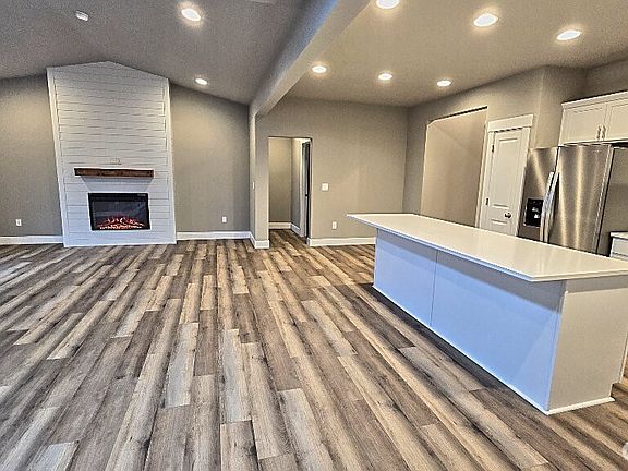 Open floor planExtensive hard surface flooringLarge island kitchenFull height backsplashStainless appliancesQuartz counters