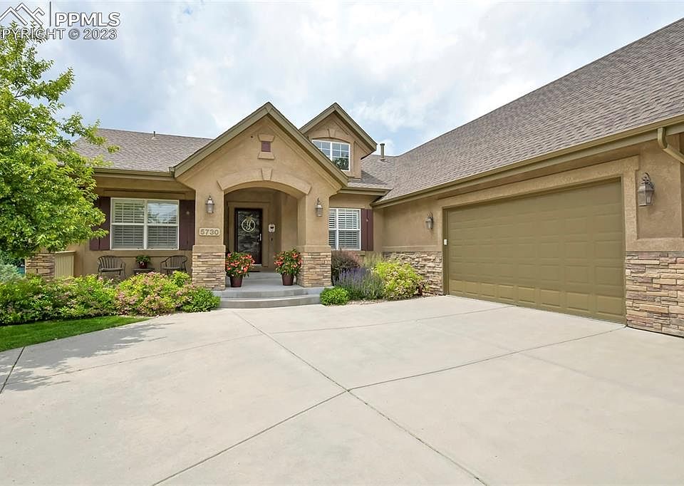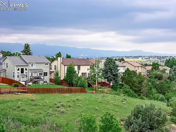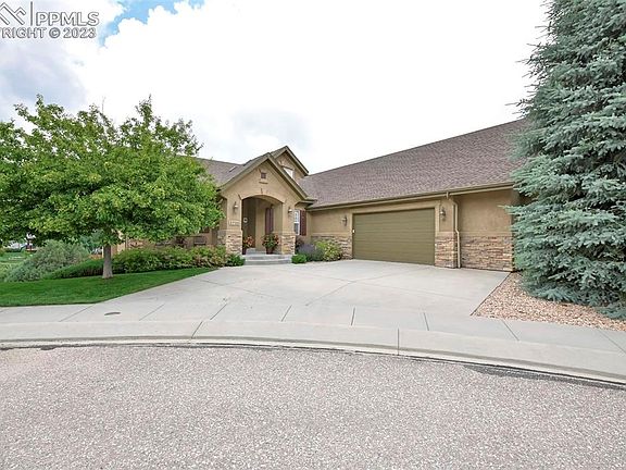 Nestled in a tranquil cul-de-sac, this stunning stucco home on a premier lot offers an immaculate living experience. Boasting 4 bedrooms, 3 baths, and an oversized 2.5 car garage, this ranch-style gem provides comfort and elegance. Relax on the great deck, capturing breathtaking views of Pikes Peak, the Air Force Academy, and a captivating wildlife-filled canyon. The gas hookup invites you to dine in your own private oasis while witnessing enchanting Colorado sunsets. Stairs lead you to open space and scenic trails. Step inside through an elegant covered porch and immerse yourself in the interior's luxurious upgrades. Newly finished wood floors, fresh carpet, and beautiful lighting adorn this stunner, complemented by custom window treatments. The main level's great room welcomes you with a stone fireplace emanating warmth on chilly Colorado evenings, and large windows with custom shutters framing the expansive Colorado sky. The exquisite eat-in kitchen features classic cherry cabinets with under lighting, Corian countertops, and a custom tile backsplash. Admire picturesque views of Pikes Peak while dining, and revel in the convenience of a double oven and new refrigerator. The master bedroom offers a spacious retreat with crown molding, a 5-piece bathroom featuring ceramic tile, and a generous walk-in closet. The office boasts custom built-in shelving and French doors, while a full bedroom and bathroom complete the main level. The convenient main-level laundry room leads to an oversized garage with 12 ft ceilings, a workbench and ample storage. The basement is bathed in natural light and offers another expansive living room area. Entertain effortlessly at the full wet bar with a refrigerator, custom wine cabinet, and television inlet. Two large bedrooms share a full Jack and Jill bathroom, while a remarkable theater room awaits with custom shelving and leveled theater seating. Ample storage space is also included. Surround sound throughout the home.