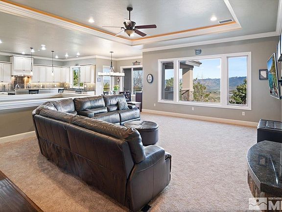 Spacious luxury in The Reserve at ArrowCreek! Versatile living abounds with this expansive, yet comfortable floorplan. Enjoy main-level living, enhanced by a Home Theater, Wine Room, Wet Bar, dedicated Office, and multiple flex spaces to suit your lifestyle. Upscale KitchenAid appliances, heated floors in Primary Bath, oversized 5-Car Garage, and much more. Outdoor living beckons with abundant patio options, fire and water features, and a fully-fenced backyard. Sensational mountain and valley views!, The Primary Suite, two Guest Suites, Office, Kitchen, Great Room, and Laundry all conveniently reside on the main level. A large Bonus/Game Room, Wet Bar, Home Theater, Hobby Room, 1,000-bottle temperature-controlled Wine Room, two additional Guest Suites, and an impressive 800 SF Flex Space (not included in square footage) dwell on the lower ground floor. Your home movie experience awaits – the theater is wired for sound and projector. Central vacuum, CAT5 wiring, and dual recirculating hot water heaters provide instant hot water throughout. 4-Zone HVAC with dual furnaces and central air conditioners provide efficient heating and cooling. A/C Unit includes air purification system. Oversized 5-Car Garage include epoxy flooring, dog-wash station, and hot/cold hose bibs. Relish the views with multiple outdoor options, including inviting entry courtyard, three covered patios, two fire features, water feature, and a fully-fenced backyard. All ArrowCreek residents can enjoy the Residents’ Center, which includes a community pool complex, tennis and pickle ball courts, basketball court, fitness center, playgrounds, BBQ areas, open lawn space with surrounding par course, and miles of walking trails. The Club at ArrowCreek recently unveiled a remarkable $70M expansion. Members can enjoy 36 holes of golf, elevated dining outlets, pool amenities, state-of-the-art fitness center, driving range, putting greens and chipping areas, Bocce Ball, special event spaces, and clubhouse activities and events. There is no membership offered with this sale; please inquire with ArrowCreek’s Membership Director for membership options and availability. ArrowCreek is a private gated golf course community with 24-hour manned security. Just 20 minutes to the Reno-Tahoe International Airport, 25 minutes to Mt. Rose Ski Resort, and a short 40-minute drive to beautiful Lake Tahoe.