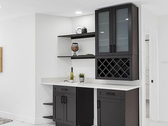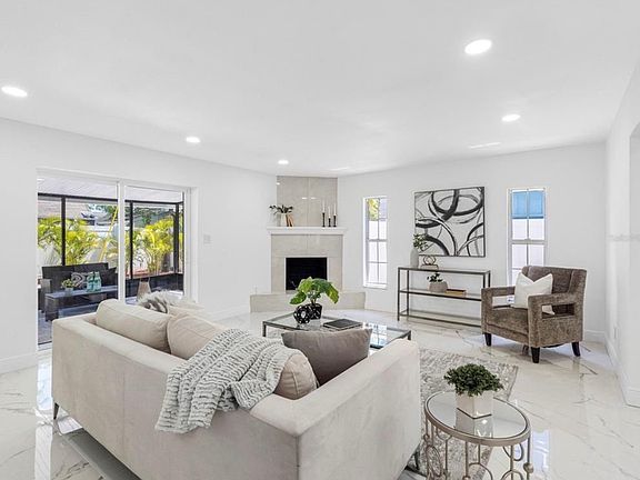 This fully renovated 3-bedroom, 2-bathroom home offers modern luxury with high-end finishes and spacious indoor-outdoor living. Interior highlights include porcelain tile flooring, a chef's kitchen with quartz countertops, stainless steel appliances, island storage, and a view of the 31x10 ft screened, and ceramic tiled lanai, plus an expansive 19x15 living area with a bay window and modern fireplace. The master suite features mirrored closets and a spa-like ensuite bathroom, while both bathrooms showcase sleek black fixtures and contemporary design. And for a wine connoisseur or entertaining guests in style, find here too a bar space! **Key updates ensure peace of mind: plumbing and electrical systems have been fully inspected by licensed, certified professionals (inspection reports attached). Additional upgrades include a new A/C unit, new water heater, and a 2020 hurricane-rated metal roof.** Enjoy outdoor living with a 31' x 10' screened lanai with ceramic tile, a fenced