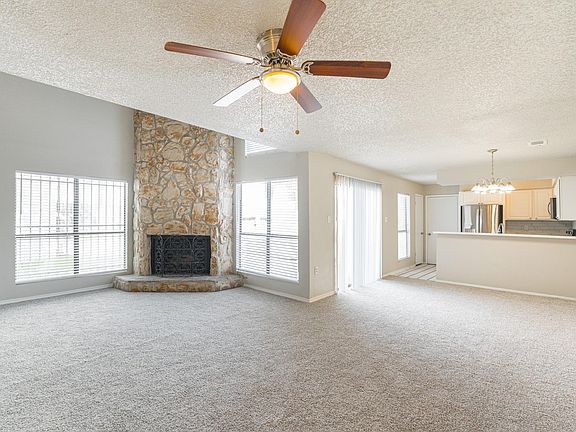 Spacious two-story townhome located in the Pine Village North community. This home features an open living and dining area with a stone fireplace, large windows that fill the space with natural light, and access to a private patio. The kitchen is equipped with updated appliances, a stylish tile backsplash, and generous counter space. Recent updates include fresh interior paint in neutral tones, new carpet throughout, and ceiling fans in key areas.