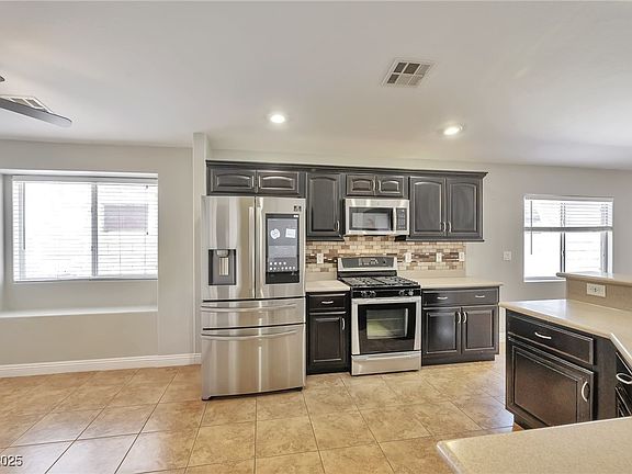 Please come take a look at this beautiful single story 4-bedroom home. Located in a small inviting gated neighborhood, this almost 2000 sq. ft. turn key home includes 4 bedroom, 3 baths and has a large 'Nevada room' which could be used as a 5th bedroom/office! Modern open floorplan includes vaulted ceilings, surround sound, 2-tone paint, 4-inch molding, ceiling fans in all bedrooms and living room. Google Nest and 4 cameras staying. Kitchen includes a walk-in pantry, granite countertops, all appliances plus smart fridge! Dedicated dining room next to kitchen. Walking distance to WinCo, Smiths, Walgreens and a half mile drive to Costco, Walmart and restaurants. Well maintained professionally landscaped front yard, concrete deck and artificial turf in backyard. Also, a storage shed in backyard with in-ground hookups for gas and power (ready for your hot tub)! Home has been professionally cleaned. Epoxy flooring in garage. LOCATION, LOCATION, LOCATION! 1 STOP LIGHT TO THE I-215!