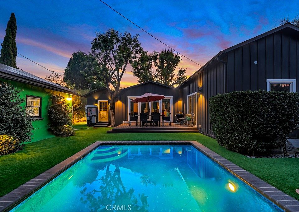 The airy great room is accentuated by large modern bi-fold doors that open up completely to reveal a brand-new deck and an exquisitely landscaped backyard. The outdoor space boasts a heated saltwater pool and a Studio ADU equipped with its own full kitchen. Additionally, the property is outfitted with fully paid-off Tesla solar panels and two Tesla batteries, enhancing its energy efficiency. This incredible opportunity is not to be missed!