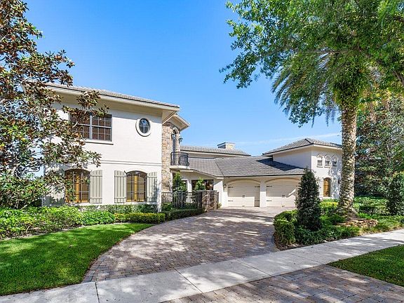 Welcome to this custom lakefront home, perfectly nestled in the highly coveted Hamptons subdivision of Woodfield Country Club. This four bedroom, plus bonus room, five bedroom bathroom residence exudes incredible curb appeal, showcasing a charming stone facade, arched windows, and a wide lakefront lot that offers sweeping water views. The property blends timeless elegance with a relaxed sophistiscation. As you arrive, a circular driveway gracefully leads you to the entrance, setting the stage for the home's breathtaking interior. Step inside to 4,070 square feet of thoughtfully designed living space, where impact windows flood the interior with natural light. The combination of wood and marble flooring, along with graceful arched doorways, adds a touch of elegance.The heart of this home is the impressive great room, featuring soaring vaulted ceilings, built-in wet bar, and breathtaking lake views perfectly designed for both grand entertaining and intimate gatherings. The adjacent chef's kitchen features two Wolf ovens, cooktop, microwave, refrigerator/freezer and dual dishwashers built into the island with additional seating and storage all while offering serene lake views. The cabana bath conveniently serves both the indoor and outdoor pool areas. Retreat to the cozy den with a wet bar or the inviting dining room, perfect for hosting dinner parties. The primary bedroom conveniently located on the main level, takes full advantage of the expansive lake views, and features his and her custom closets, a whirlpool tub, glass-enclosed shower, and dual sinks with a makeup vanity. Rounding out the first floor is an ensuite bedroom that is currently being used as an office, a spacious room that can easily be divided into two separate rooms if needed, and a remodeled bathroom and laundry room. Upstairs, are two additional ensuite bedrooms, each featuring high ceilings. French doors from the kitchen open to the patio, ideal for year round entertaining, alfresco dining, or relaxing by the pool and spa while enjoying one of the best lakefront views in the community. The oversized garage offers parking for two cars plus a golf cart, and new epoxy flooring along with an air-conditioned storage closet. Don't miss your chance to own this home before the membership fees increase on November 1st.