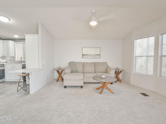 55 plus gated community and you own your land. This open floor plan offers an updated kitchen with new flooring throughout. Beautiful renovated bathroom with a walk in shower. Unfinished storage room could easily be converted into additional living space or use as a craft room, workshop or Arizona room. Side yard has golf cart parking and room to add an outdoor area to enjoy the beautiful Arizona weather to entertain your family and friends. New heat pump in 2023. Active community with a heated pool/spa, tennis, pickleball, basketball, shuffleboard, billiards, putting green, common areas and clubhouse with many amenities and community events. Community is near, golfing, hiking, shopping, restaurants, hospitals the US 60 and Red Mountains 202 for easy access around the valley