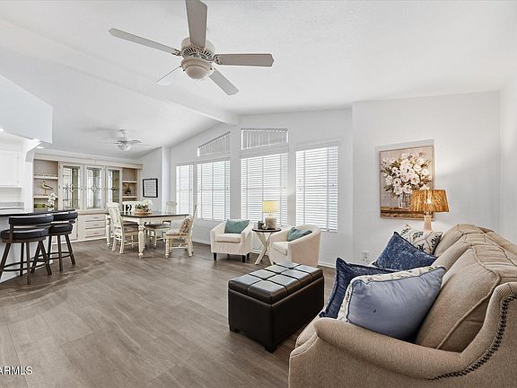 Previous model home and still shows like a model. Buyer owns the land. Custom blinds and closet organizers. New Flooring and paint. Updated bathrooms. Vinyl plank and tile throughout home. Large Arizona room for events, craft/hobbies or additional storage. Second additional storage unit. Water softener and filtration. Close to entry, community clubhouse, pool and outdoor activities. Looks of events in this over 55 community. Low HOA fees include water, sewer, garbage, cable tv, heated pool/spa, exercise room, library, art room, billiard room, tennis/pickleball courts and parks.