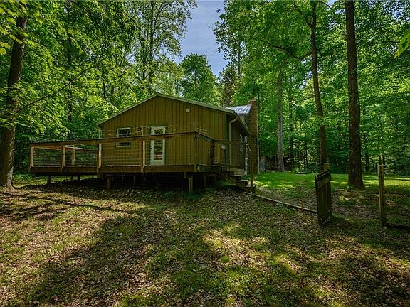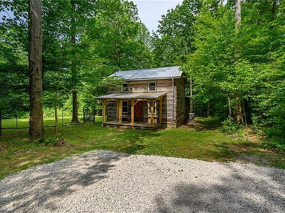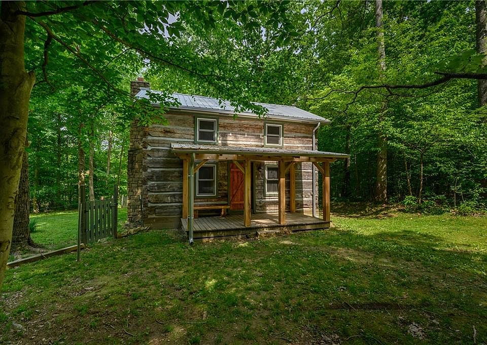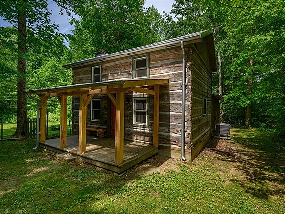 Cute-as-a-button log cabin on 7 wooded acs with a shared lake. This 1 BR plus loft, 1.5 BA, 2009 antique log home was built by Peaceful Valley Construction with real mortar chinking and Brown Co. Stone for the wood-burning fireplace. This all electric cabin features wide plank hardwood floors throughout, hickory cabinets, a loft w/antique log handrail, clawfoot tub, thermal pane windows, cathedral ceiling in living room, covered porch, wood deck in the back, & a fenced area for the pups. Take an easy walk down the path to the lake for fishing off the shore or in your john boat! The original smaller cabin still exists on the grounds & could easily become a mancave/she-shed or even a guest house with some repairs. Fiber internet connected.
