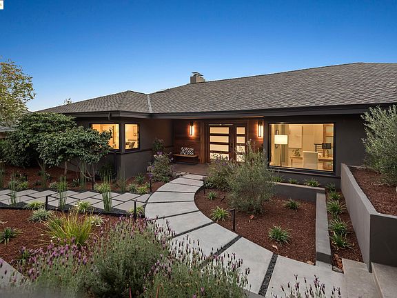 Perched in prestigious Claremont Pines, 5737 Country Club Drive is a reimagined 1952 residence that masterfully marries midcentury heritage with contemporary sophistication. Expanded and meticulously renovated, the home embraces natural light, clean lines, and sweeping views of the San Francisco Bay and skyline. A private garden entry and custom pivot door lead to the main level, where a dramatic living room with fireplace and wall-to-wall glass accordion doors open to a deck with frameless railings. At the heart of the home, the kitchen and dining room showcase a sculpted stone island with dual faucets, a bespoke coffee bar with brass sink, & a prep bar with wine fridge, and secondary dishwasher. A pantry, laundry suite, two powder rooms, garage, office, & ensuite bedroom complete the level, while the primary suite offers dual walk-in closets & a spa-inspired bath with glass rain shower, freestanding tub, custom stone vanity, water closet, & sliding doors that frame the view. The lower level features a family room with fireplace and wet bar, two ensuite bedrooms, a theater, wine cellar, flex room, & fitness space opening to landscaped gardens and a flat lawn—seamlessly blending hillside tranquility with urban connectivity for a rare fusion of architecture, setting and lifestyle.