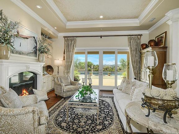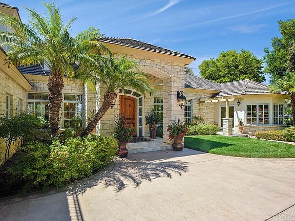 Welcome to gated Lake Vista Estates, located in the beautiful hills of Bonsall, California. Enjoy moderate temperatures and ocean breezes - only 13 miles to the Pacific Ocean. This light-filled, Mediterranean home welcomes you with a circular driveway, Austin limestone details and lush landscaping. The large double doors open to a living room with high ceilings, fireplace and view of the salt-water pool. To your right is the expansive dining room with seating for 10 guests. Through a pair of arches, you enter the heart of the home, a recently remodeled kitchen with cream variegated granite counters and painted custom cabinets. The kitchen includes a built-in Sub-Zero freezer and refrigerator, Dacor double ovens, Wolf cooktop and large granite island. To one side of the kitchen is a large eating area and the other a family room with a secret door accessing a sparkling powder room. Multiple glass doors lead to the outside entertaining areas. All bedrooms are located at the other end of the house. The Primary Suite, with double glass doors opening onto the backyard, provides a sunny and relaxing retreat that includes a beautifully remodeled bathroom suite with two vanities, walk-in shower, soaking tub and 2 closets. Also, downstairs is an optional bedroom/office/den with a full bathroom and closet. The separate laundry room is located off the back hall leading to the 3-car garage. Upstairs are two bedrooms, a large, remodeled bathroom and balcony. The backyard is an entertainer's dream with pool, spa, fireplace, dining, BBQ, gardens, water fall and lovely privacy. This property is completely landscaped and has an automatic, irrigation system. There is also a second, 2-car garage that can easily be used as a studio, additional storage or converted to an ADU. The home has its own solar system and separate pool solar panels.