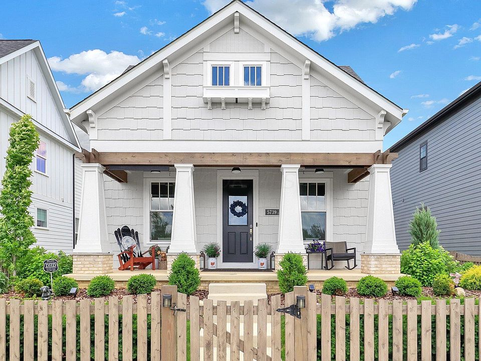 ''I LOVE Evans Farm but want a First-Floor Primary suite and an open floor plan''. This is it!! Watch the sun set over the ponds from your front porch of this Craftsman. Gather around the island in the kitchen, sit in the dining room, or curl up by the fireplace in the great room, this design is ideal for entertaining. Mingle out to the covered porch, let your furry friends out into their fenced yard, or tinker in the oversized two car garage. The primary suite and laundry room round out the first floor. Upstairs has two more bedrooms and a shared bathroom. The basement has two entertaining spaces, with a rough-in for a wet bar., and an additional room has an egress window and could be the fourth bedroom/home office.. Evans Farm is a lifestyle community, and this home is on point!