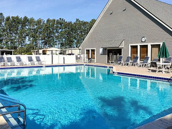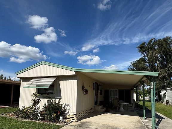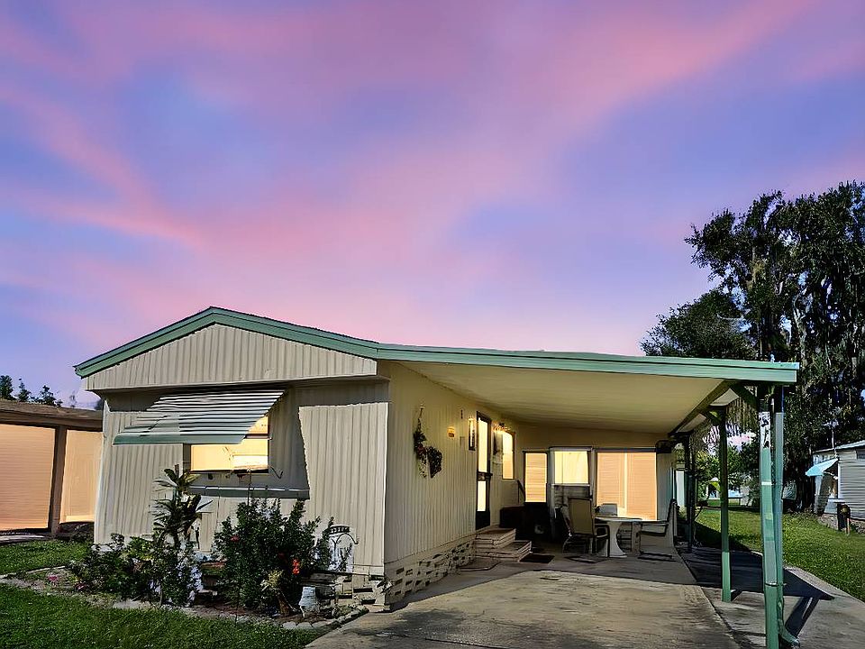 You don't want to miss this great deal on a 2-bedroom/1-bath home in Hidden Golf Club, a 55+ gated community conveniently located on Lake Henry in Central Florida with tons of amenities! This spacious home has all the extra features Florida living offers. It has an open concept floor plan with a vaulted ceiling that creates a spacious feel. It also has a fully enclosed Florida room and informal seating outside in the extra-large driveway. This extra living space offers the perfect spots to enjoy a cup of coffee, a good book, or to entertain friends/family. Laminate flooring runs throughout the main living areas for easy maintenance. The eat-in kitchen comes with newer cabinets, countertops, and appliances for all your culinary needs. Take advantage of ample storage space inside and outside the home, including a large pantry just off the kitchen. The primary bathroom has been updated with a walk-in shower for your convenience. The shed offers more storage with laundry facilities, making daily chores a breeze. FURNISHED and a turn-key opportunity, there's never been a better time to begin the Florida lifestyle you deserve. Hidden Golf is a 55+ gated community with an abundance of amenities such as a heated pool, clubhouse, onsite pub/restaurant, 18-hole executive golf course, off-leash dog park, lake access, shuffleboard/tennis/pickleball courts, bocce ball, exercise room, outdoor storage, and a billiards room. WOW! This community is very popular as it is known for its friendly, fun atmosphere with plenty of activities, including dances, potlucks, cards, bowling leagues, golf leagues, golf cart parades, church services, entertainment, holiday parties, etc. Park approval is required of all potential residents. The application process includes passing a background check. Although this is a 55+ community, anyone 40 years and above may apply. Don't let this one get away. Call one of the listing agents to schedule an on-site or virtual tour. NOTE: All listing information is deemed reliable but not guaranteed and should be independently verified through personal inspection by appropriate professionals. Our company does not and cannot guarantee or warrant the accuracy of this information or the condition of this property. The buyer assumes full responsibility for obtaining all current rates of lot rent, fees, and pass-on costs. Additionally, the buyer is responsible for obtaining all rules, regulations, pet policies, etc., associated with the community, park, or home from the community/park manager. Our company is not responsible for quoting said fees or policies. Financing is available through 3rd party lenders. The sales price does not include tax, dealer fees, or administrative fees.