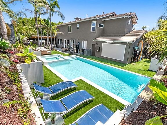 Welcome to this completely redesigned organic modern home just 1 mile to Moonlight Beach & Downtown Encinitas. This immaculate home features 4 beds, 4 1/2 baths + office/bonus room & is ideally located next to SD Botanic Gardens & Encinitas Ranch Golf course. NO HOA fees! With vaulted ceilings & many windows, this 2 story home is flooded with natural light. You can see the beautiful landscaping from most rooms in the home, making it ultra private & quiet. The gourmet kitchen features a center island with seating, along with a kitchen nook, walk in pantry, Sub Zero fridge, gas cooktop, wine cooler & more. The open concept kitchen connects to the spacious family room with built-ins & a fireplace. Most of the rooms overlook the private & lush backyard with newly added pool, spa & movie screen, game room & shower. On the first floor, you will find a guest bedroom with ensuite bath plus an additional powder room, built in office nook, laundry room & access to 2 garages. The 2nd floor features the primary suite with a fireplace, deck & a stunning large bathroom with dual vanities, a seated vanity, soaking tub, shower & two walk in closets. Two additional bedrooms & home office are also on the 2nd floor. The backyard is the perfect combination for dining & entertaining. Other upgrades include PAID for Solar with back up battery, new concrete flooring, new carpet, freshly painted interior & exterior, new staircase, updated fireplaces, dramatic light fixtures, newer A/C & appliances. Walk or bike to shops, restaurants, beaches & parks. This is a stunning DO NOT MISS HOME!