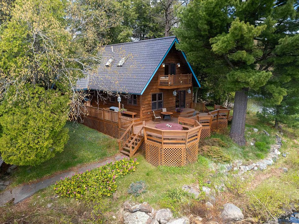 Escape to your own secluded paradise with this unique island retreat. Imagine arriving by a private drive to find a serene cabin, nestled on 1.75 acres of pristine woodland surrounded by the area's most breathtaking lake. This meticulously maintained home, built in 1991, and newly remodeled, features a stamped metal roof and a wrap-around deck with built-ins offering picturesque views of the water. Inside, you'll find one bedroom and one full bath on each floor, with ample storage and a versatile living area on the second floor that could serve as an additional sleeping space. The property includes a well-equipped pole barn, originally a two-story oversized garage with 600 sq ft workshop above. It is complete with high ceilings and oversized doors for easy access. Electrical connections extend to the barn and all sheds, ensuring convenience for all your projects and storage needs. A permanent concrete dock and multiple sheds provide ample space for storing water toys, lifejackets, and gardening tools. Whether you prefer to relax in a hammock, go boating, fishing, or kayaking, or tinker in the workshop, this island haven offers endless possibilities. Ideal for year-round living or seasonal escapes, this property is perfect for creating cherished memories with family and friends, and best of all, no boat is required to reach your retreat. If you would like the opportunity to own a larger family estate, please view 572 and 576 Red Rd for sale by the same owner.