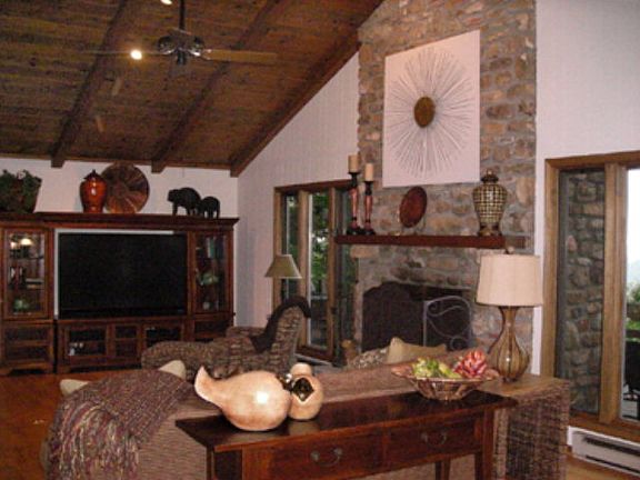 THE PERFECT MOUNTAIN COTTAGE! A tastefully updated one-level retreat with 3 bedrooms and 3 full baths. Private wooded home includes adjacent lot with rock out-croppings. Great deck and outdoor living space. Spacious driveway with plenty of parking area. Open great room with vaulted wood tongue and groove ceilings. Hardwood floors throughout. Updated kitchen with stainless steel appliances and granite countertops. Impressive, natural stone fireplace. Granite countertops in the bathrooms. Large master suite and bath. Ample closets. Central air/heat. Clean-Space in the basement. Perfect for primary or resort living. Offered tastefully furnished. Move-in ready!