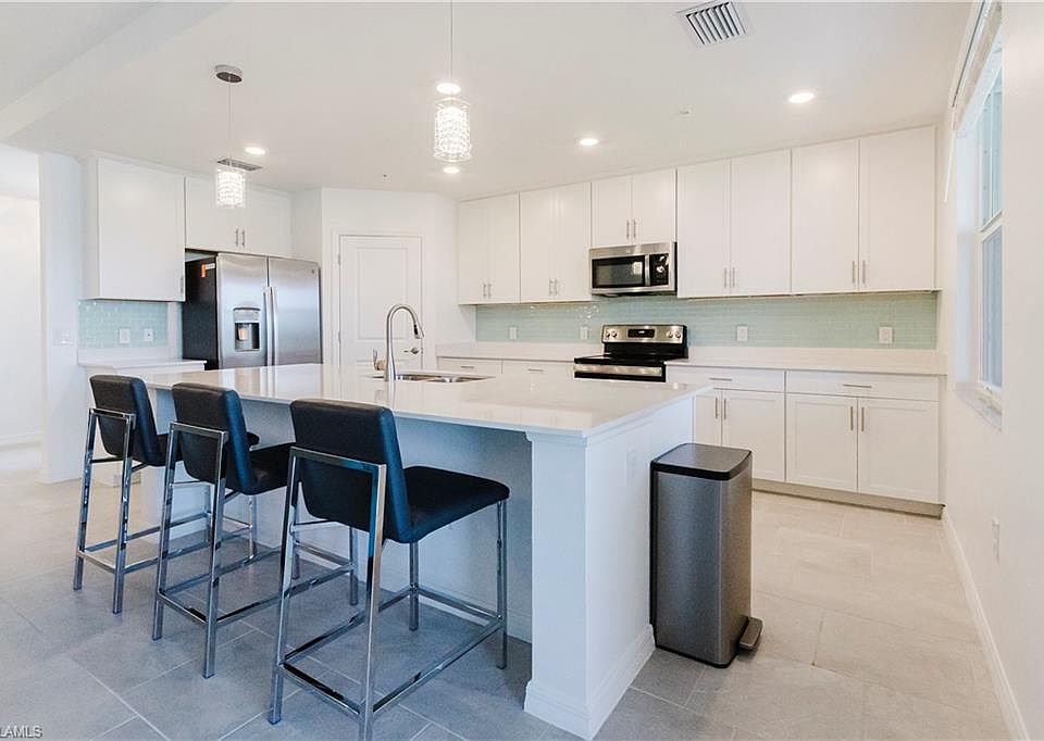 Golf membership included, stunning Arrowhead Model Coach Home in the National Golf & Country Club at Ave Maria. This beautifully furnished 3-bedroom, 2-bath Arrowhead model coach home offers breathtaking golf course views and access to upscale amenities within the prestigious, gated National Golf & Country Club at Ave Maria. The spacious, open-concept floor plan features a modern kitchen with Quartz countertops, stainless steel appliances, and a large center island, perfect for cooking and entertaining. The bright and inviting living and dining areas open to a private, screened-in lanai, ideal for relaxing or enjoying Florida’s serene sunsets. The primary suite boasts a walk-in closet and a luxurious en-suite bathroom, while two additional bedrooms provide ample space for guests or remote work. Residents enjoy access to resort-style amenities including a clubhouse, fitness center, spa, tennis and pickleball courts, and a resort-style pool. On-site dining adds to the convenience and appeal of this community. Golf membership is included with this home, offering access to the stunning golf course. This home is move-in ready and perfect for those looking to enjoy the best of Florida living in a secure, upscale community.