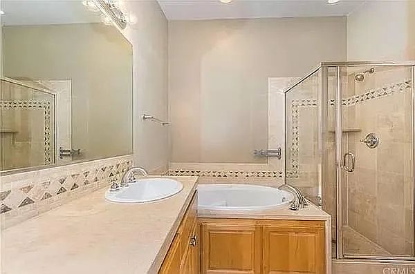 Master suite with marble-tiled en suite bath, mirrored closet, and walk-in closet