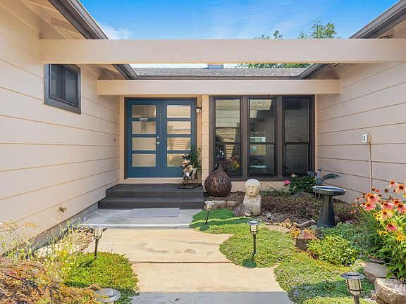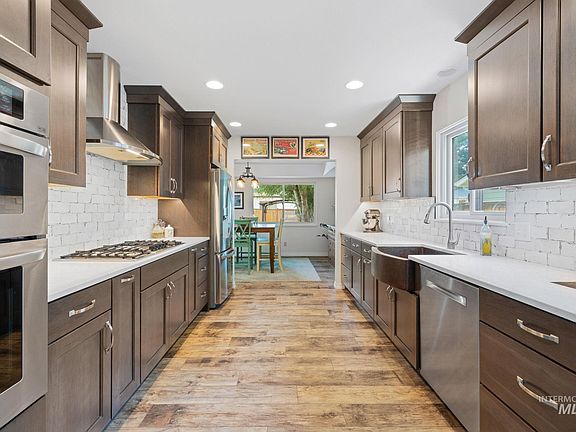 Cool off in the refreshing inground pool! Thoughtfully renovated mid-century modern home with a private courtyard entry. The kitchen is a chef's dream featuring a stunning farmhouse-style hammered copper sink, designer tile backsplash, stainless steel appliances, built-in oven, Bosch five-burner gas stove & more! Retreat to the primary suite, boasting private access to the back patio, an oversized walk-in closet & renovated bathroom with a low-curb tile shower & elegant double-sink vanity. Entertain guests effortlessly with the built-in bar. The outdoor patios create ample space for gatherings. Anderson windows & high-efficiency gas furnace. A fully landscaped yard with mature shade trees creates a relaxing outdoor oasis. The secondary ensuite bathroom is ideal for a guest room or home office. Freedom & privacy of no silly HOA rules or excessive fees. It is located on a dead-end, low-traffic cul-de-sac. Steps away from Skyline Park, with easy access to all of Boise.