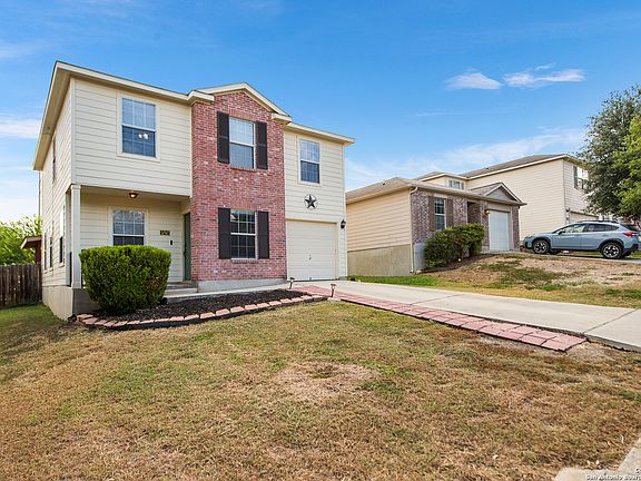 A charming home near the neighborhood park and close to Potranca Creek, this home is nestled in a quiet neighborhood with schools and access to Hwy90/Loop1604 in proximity. Less than 15 minute drive to Lackland AFB! This home boasts many upgrades and features. Garage is EV level 2 ready, kitchen has beautiful quartz counter tops, new stove, dishwasher, and microwave over cooktop. LG Fridge included is 18 months old! Water heater is less than two years old. AC is about 2 years old and is energy efficient, yielding low energy bills during those hot summer months. Ceiling fans throughout the home. The home hosts plenty of storage space including a generously sized pantry in the kitchen. Bedrooms feature walk in closets. The backyard is not to go unnoticed! A spacious covered deck perfect for entertaining, includes the wall-mounted TV shown and includes a lawn mower to maintain this space. The end of the property backs up to a green area with mature trees. Property is well maintained and more than inviting- come make this home yours today!