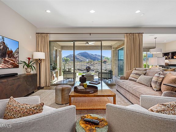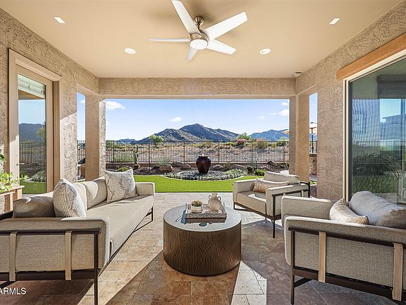 EXCEPTIONAL Taylor Morrison Shire floorplan on 9th tee box of Victory course capturing awesome views of open space & mountains. Highly upgraded throughout in every detail: Great room w/16' sliders to extended covered patio; Chef's kitchen w/top of line cabinets/appliances, lighting, counters; dining buffet cabinetry w/wine & Bev coolers; beautiful laminate wood flooring, custom lighting; Owners' retreat w/custom window treatments, upgrade bath fixtures & tile; two guest rooms w/upgraded ensuite baths; spacious office/den; Creative Environments landscape incl travertine, stacked stone BBQ island, fire pit, water feature, lighting; and the VIEW! See docs tab for extensive list.
