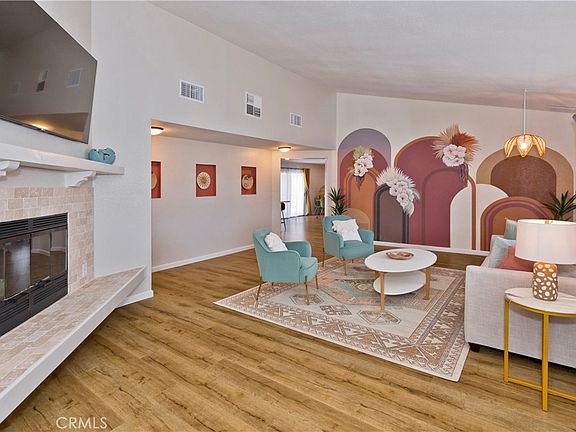 Pulling into the ½-acre lot, you’ll notice a chic blue façade with white trim, a double garage door, and mature Joshua trees. A covered patio welcomes you as you stop to admire the phenomenal views of the cityscapes along with the majestic mountains. Stepping through the front door, you’ll find a character-driven floor plan featuring a stunning hand-painted mural, stylish wood laminate flooring, a tasteful color scheme, decorative shelving accents, and a beautiful fireplace that ties it all together.