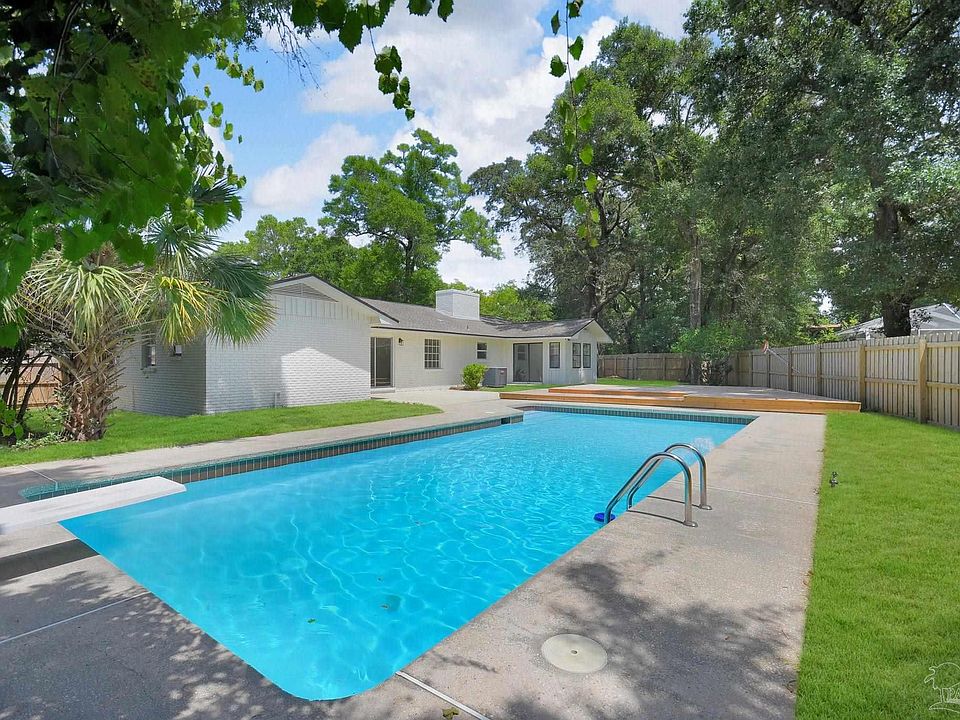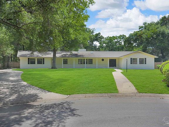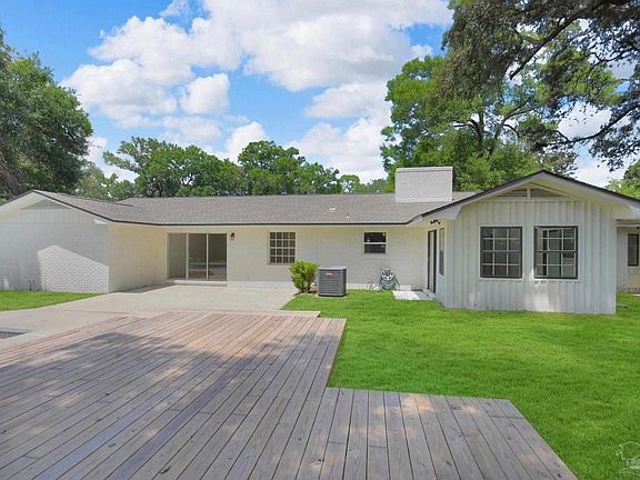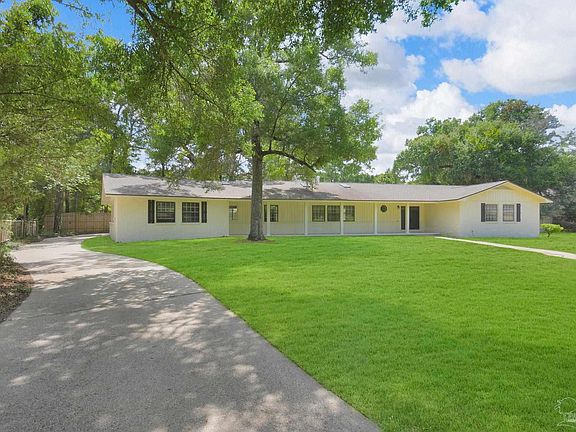 Welcome to 5745 Avenida Robledal, a beautifully updated 4-bedroom, 3-bathroom home located in the desirable Bay Oaks neighborhood of Pensacola. This spacious 2,668 sq ft residence sits on nearly half an acre and offers a perfect blend of comfort, functionality, and style. Inside, the home features luxury vinyl plank flooring, fresh interior paint, new windows, and skylights that fill the space with natural light. The gourmet kitchen boasts quartz countertops, a gas cooktop, and a built-in microwave, opening into a formal dining area ideal for entertaining. The living room showcases a floor-to-ceiling brick fireplace and elegant crown molding. All bathrooms have been fully remodeled with quartz counters, modern fixtures, LED mirrors, and custom tile walk-in showers with glass doors. The primary suite offers added privacy with dual sliding barn doors leading to a spa-like bathroom. Step outside to enjoy a large backyard with a sparkling pool, deck, mature oak trees, and a carport with an attached storage room—perfect for relaxing or hosting. Conveniently located just minutes from downtown Pensacola, hospitals, schools, and Pensacola Beach, this home is truly move-in ready and offers both lifestyle and luxury.