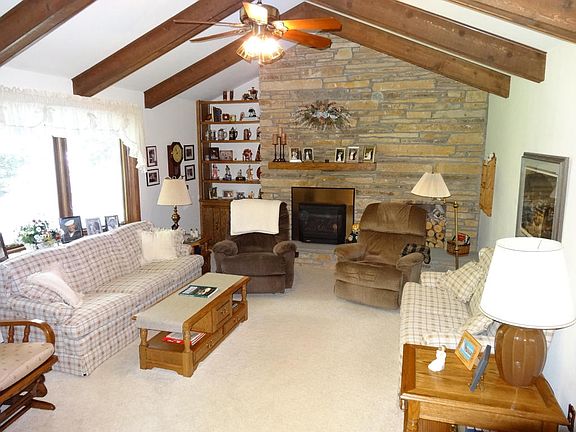 Boscha-built, one-owner sprawling (2327 sf) FOUR BR ranch on nearly 1/2 wooded acre. Family room has beamed cathedral ceiling, newer bow window overlooking the yard, efficient gas insert in the stone fireplace. Dinette in the kitchen plus more formal DR. Remodeled master bath w/ walk-in shower. Kitchen features CT backsplash & neutral newer counter, new patio doors to gigantic deck, & built-in china/display cabinet. 2.5 baths, 1st fl laundry. Full basement. Quick access to Kenosha and I-94; close to dining and shopping. New roof, 9/16; new furnace, 11/16.