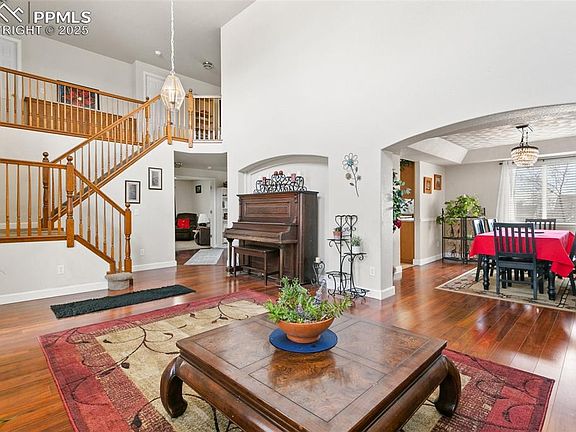 Stately 2-story with 5 bedrooms and a 3 car garage. Room for everyone and their cars! The main level has soaring ceilings, open rooms, formal and informal spaces. The living room has a bay window, an arched niche and arched entry to the formal dining room. The kitchen features a walk-in pantry, tons of storage and counter space, center island, granite counters, stainless appl and a walk-out to the deck. The dishwasher and refrigerator have been upgraded in the last year. The eat-in kitchen walks out to a large, composite deck with metal rails. The main level also contains a family room with gas fireplace, an office with double doors and a closet and a laundry room with folding counter and extra storage space. The upper level has 3 secondary bedrooms, a full bath and a large primary suite. The primary suite has double doors, a sitting area, 5 piece bath and a walk-in closet. The finished basement feels like a separate retreat with a rec space and large bedroom. The 3/4 bath has a full walk-in shower. There is storage space near the mechanical room that has been considered for a kitchenette, but never completed. There is also a large crawl space for additional storage. This clean, quiet neighborhood boasts parks, schools and easy access to the Powers corridor for dining, travel, shopping, etc.