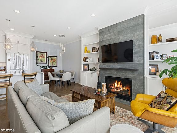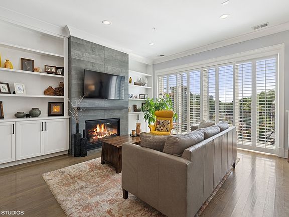 Built in 2020, this jewel of a penthouse is light, airy, and bright, with two private outdoor areas, heated garage parking, and large storage on unit floor hallway. Enter into a generous vestibule with plenty of closets, then turn into the beautiful main living space. Gracious living room enjoys an easy gas fireplace, flanked by custom bookcases/shelving; dining area is illuminated by a lovely sparkling light fixture. Open kitchen boasts floor to ceiling custom cabinets, quartz counters and extra wide waterfall island, and stainless steel appliances. Pretty plantation shutters allow as much or as little light from the deck; east exposure gives you the best sunrise views! From the main living spaces head down the hallway to the private area; you'll find a lovely second bedroom, currently used as an office and guest room. Then to the full hall bathroom, with tub. On to the gracious primary suite; the bedroom is extra large, there is an ample and organized walk in closet, and spa-like bathroom, with heated floors and steam shower. Take the elevator or stairs to your private roof deck, complete with gas fireplace, built in bench system, electrical and gas for grilling. Building has sprinkler system, high tech intercom, bike storage, and concrete between floors for soundproofing. Pretty park just outside, as well as the glorious grounds of Rosehill Cemetery; one block to the new Metra Station, and just blocks to all that Andersonville has to offer!