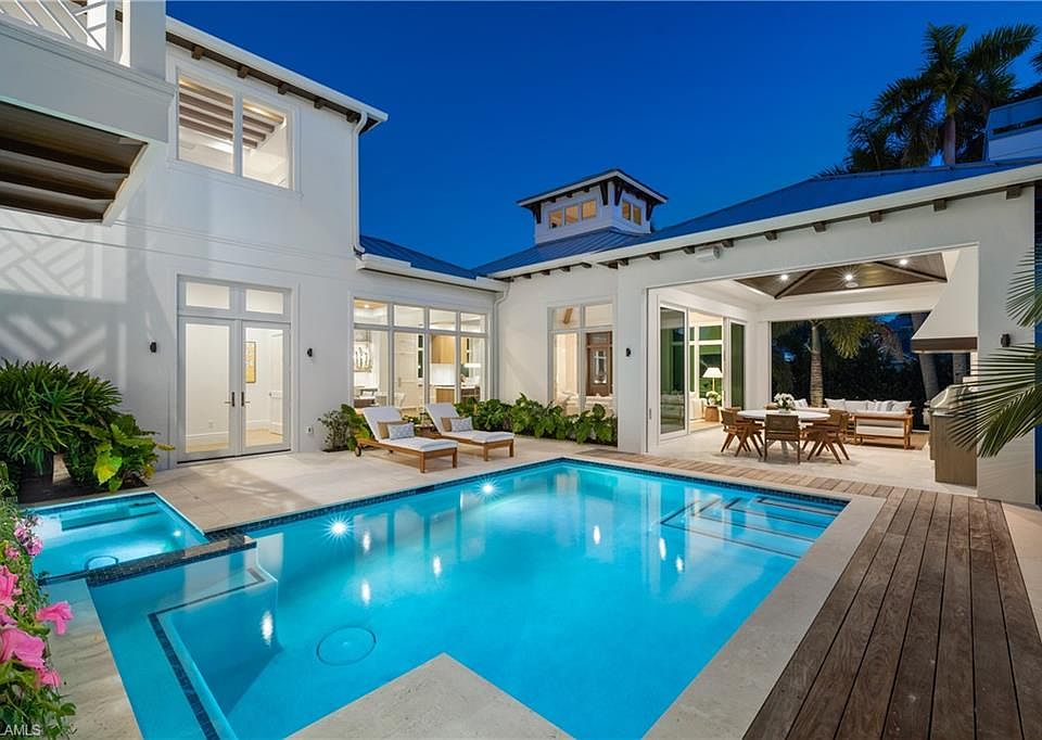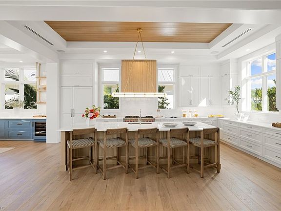 Timeless Coastal Living, Perfected. Just completed and located steps from Third Street South’s premier shopping and dining—and moments to the white-sand Gulf beaches—this new construction masterpiece delivers the ultimate blend of luxury and lifestyle in the heart of Olde Naples. A collaboration by Kukk Architecture, T. Jerulle Construction, Freestyle Interiors, and landscape architect Scott Wyndham, this residence showcases exceptional craftsmanship at every turn. With over 6,700 total square feet, the home features 5 spacious ensuite bedrooms, a dedicated office/den, an elevator, and a 3–6 car garage with lift potential—offering both privacy and effortless livability. Architectural details abound: stained oak beams accent the great room and primary suite, while guest bedrooms feature custom painted beam designs. Wide-plank wood flooring with Francois & Co. herringbone inlays set a warm, sophisticated tone throughout. Designer lighting from Visual Comfort and Palecek adds curated brilliance. The gourmet kitchen is a true showcase, with custom Goguen cabinetry, elegant hardware, a Franke sink paired with a Waterstone faucet, Cristallo quartzite countertops, and premier Wolf, Sub-Zero, and Fisher & Paykel appliances. The luxurious ambiance continues in the primary bath, highlighted by a Kallista sink and faucet and a serene, spa-inspired atmosphere. A spectacular dining room with high-gloss Ruffino cabinets with backlit Crystallo countertops and Sub-Zero wine storage sets the stage for memorable evenings. A fully outfitted party pantry elevates entertaining, whether hosting intimate gatherings or large celebrations. Designed for seamless indoor-outdoor living, the expansive lanai features a custom fireplace surround, outdoor kitchen, dining space, and generous poolside lounging areas—framing Naples’s tropical charm. The coastal palette of sandy beiges, misty grays, aqua blues, and driftwood browns blends beautifully with the natural surroundings, creating a refined, inviting sanctuary. This is a rare opportunity to own a meticulously curated home in one of Naples’s most coveted locations—where timeless design, masterful craftsmanship, and coastal luxury converge. Welcome home.
