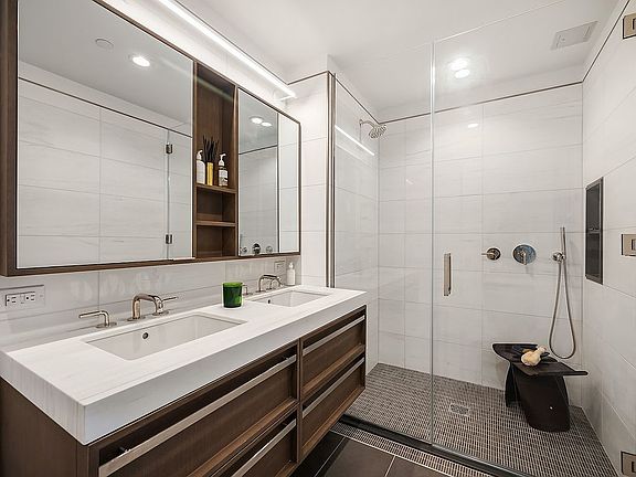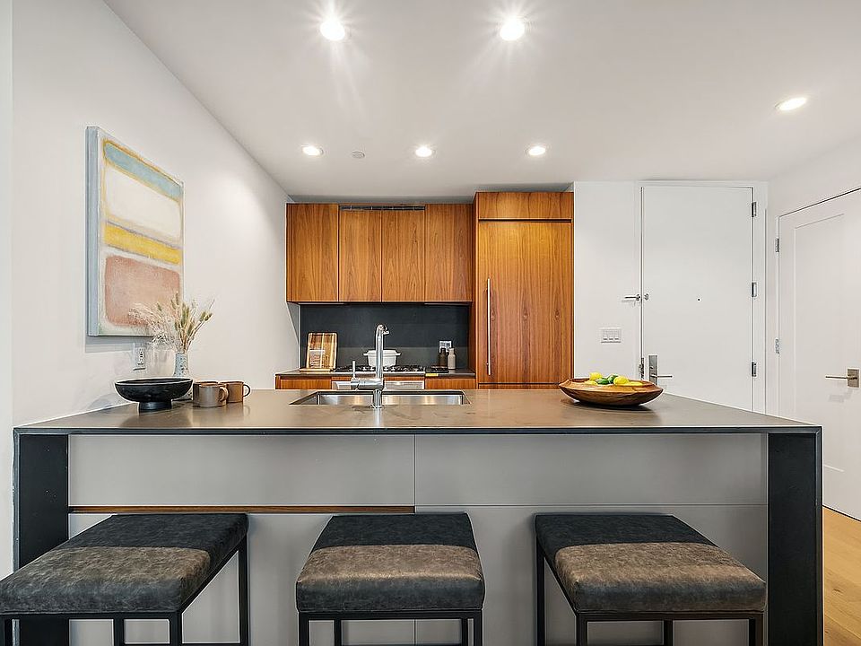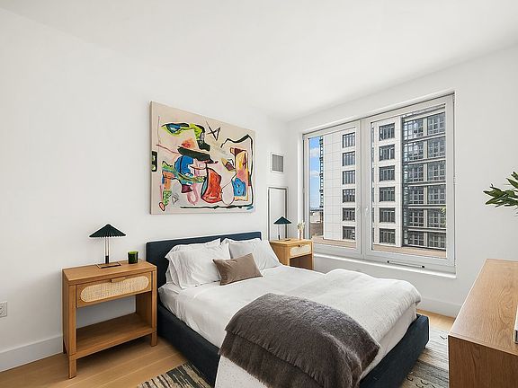 End of the Year Deal! Residence 2A, is a true two-bedroom, two-full bath corner unit with an open concept kitchen, dining and living room. Inside floor-to-ceiling double-paned windows facing Park Slope to the east and The Verrazano Bridge to the South bring in abundant light. Unit finishes include a 7" European oak wood flooring, a custom kitchen with walnut cabinetry, fully integrated Thermador and Bosch appliance package, Blum German hardware with soft close drawers, and gleaming Alleanza quartz countertop with matching backsplash. The primary bedroom offers an enormous walk-in closet, stunning en-suite bathroom with Dolomiti marble tile wall and slab countertops, Waterworks fixtures, custom oak vanity with double Kohler sinks. A generously sized secondary bedroom and additional full bathroom with soaking tub and porcelain tile walls and flooring provide spa-like comfort. A washer/dryer, multi-zone heating and cooling system, complete this luxurious, modern home.