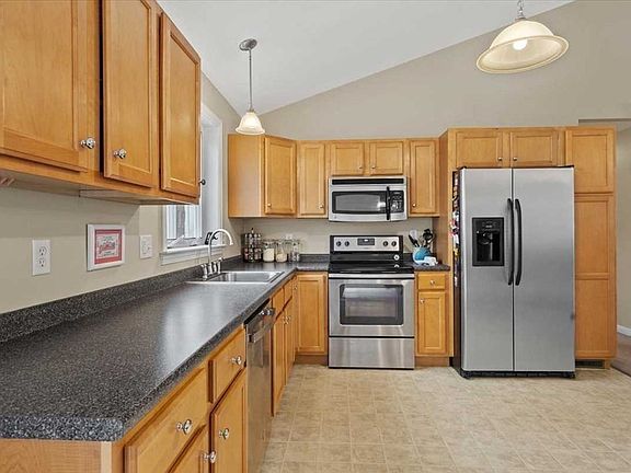 This immaculate Raised Ranch is ready and waiting for you! Enter through the front door and come up the stairs to a bright and sunny open concept floor plan featuring beautiful cathedral ceilings through the living room, dining room and kitchen-offering a generous space great for entertaining! Dining area provides a slider leading out to a deck with access to a great sized private backyard. Enjoy cooking while entertaining your guests in a large kitchen with stainless steel appliances and plenty of cabinets. This beautiful home offers plenty of light throughout, central air, a main bedroom with extra large closet and full bathroom and two good sized bedrooms. Move in ready with extra large two car garage providing extra space for storage. The unfinished lower level w/ laundry, walk out slider and access to garage is waiting for you to personalize and make your own. Conveniently located near highway access and many amenities. This home is ready for you! Open house Sat 3/25 & Sun 3/26.