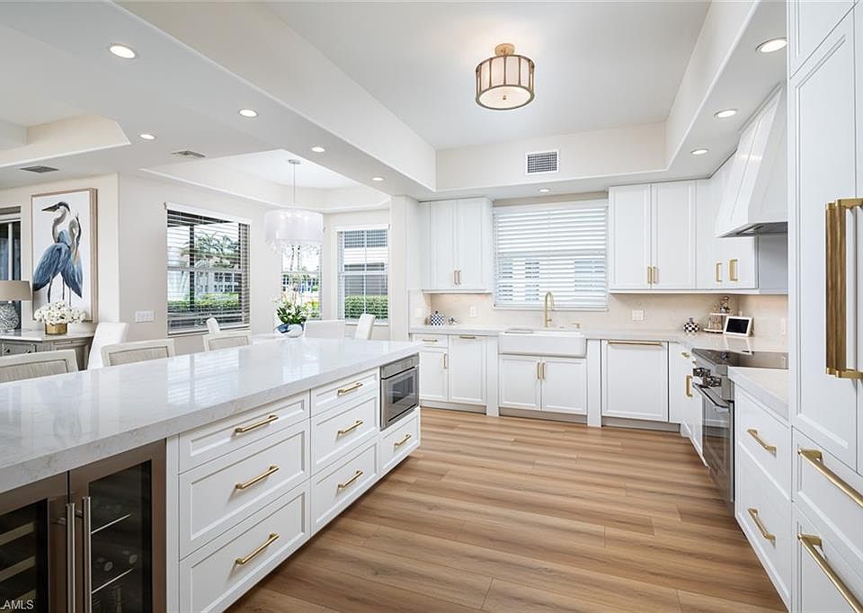 Spacious refurbished 1st floor condo in Avellino Isles inside the manned gates of the beautiful Vineyards Golf & Country Club. This beautifully renovated home offers breathtaking water views and high-end features throughout the redesigned floor plan. Three large bedrooms each with updated ensuite baths and walk-in closets plus a half bath for guests off the main hallway. Gorgeous kitchen updates include all new Thermador appliances, quartz countertops and backsplash, Kohler cast iron farmers sink w/ Rohl fixture and enlarged pantry. Primary bath features a double vanity, dedicated make-up counter, large soaking tub, walk-in shower with Newport News chrome fixtures, all accented with an Italian polished stone wall and two linen closets. Primary bedroom offers a large walk-in closet designed by California Closets. Office has two work areas with ample file cabinets and a queen size Murphy bed for the occasional extra guest. Additionally, new luxury vinyl flooring throughout, plus every room has all new light fixtures, fans, and Hunter Douglas Blinds. Avellino Isles offers an updated clubhouse with a fitness center, card room, infinity pool, spa, and large grilling area. New roofs were installed in 2024-2025, all buildings have been freshly painted and new exterior light fixtures installed in 2025. This is a rare opportunity to enjoy the best of luxury living in the Vineyards' convenient location. Memberships are available but not required, offering flexibility to suit your lifestyle. At time of listing the Vineyards has immediate golf membership available.