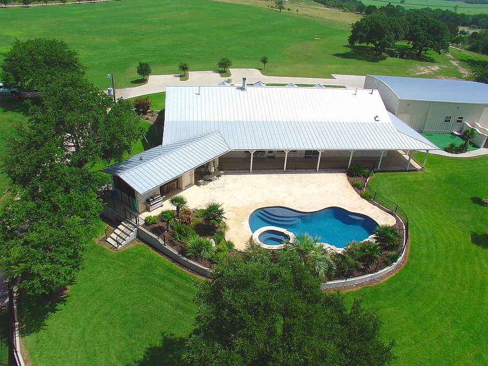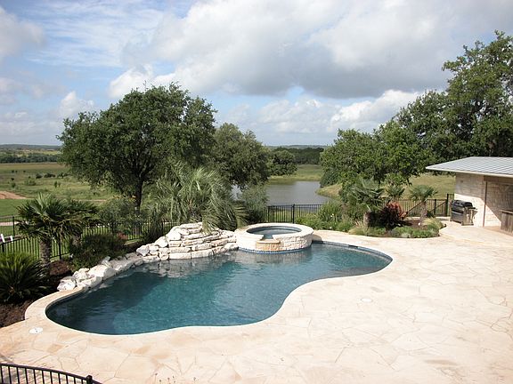 Lake Travis Gentleman's Ranch. A beautiful setting just 2 miles east of Marble Falls, Texas, this 40 acre property sits on the banks of Lake Travis with 893' of open water and a great sandy beach, next to the lake sits the "Fishing Cabin" the perfect retreat/guest house with living room, kitchen, one bedroom and full bath and a screened in porch. A charming front porch welcomes you home main house, a "Fredericksburg Style" home with 4 bedrooms and 3.5 baths sitting high on the property overlooking a sparkling blue pool, a beautiful spring fed tank, Lake Travis and 30 acres of improved fields of Coastal Bermuda. The second guest cottage is referred to as "The Gate House" near the gated entry to the property the newly renovated house has living room, kitchen, one bedroom and full bath. The property also features a 2340' sq. ft. 4 Car Garage/Workshop and a Horse Barn with stables, tack room, hay storage & cross fencing. A fantastic property with a total living space of 3498' sq. ft. with 6 bedrooms and 5.5 baths. Truly a remarkable property, perfect for a weekend retreat or fantastic full time living. Come have a look!
