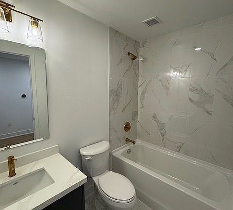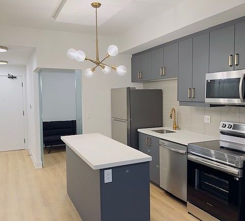 Open conceptModern kitchenDesigner cabinetsQuartz countertopsStainless steel appliancesUpgraded unitGold light fixtures