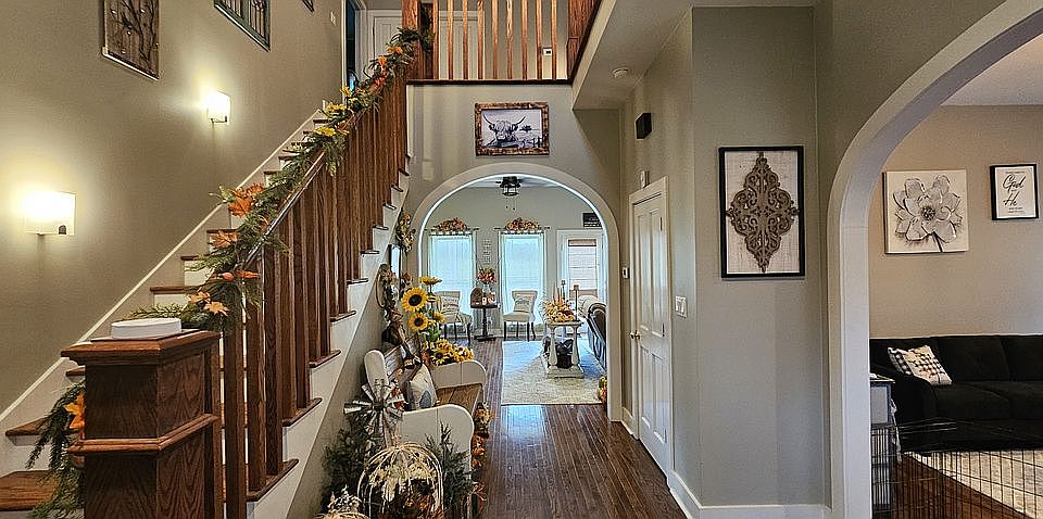 Step inside to find 10-foot ceilings, rich hardwood and tile floors, elegant arched walkways, and a stunning hardwood staircase that's truly picture-worthy. The home features a formal living room and a large dining room with custom lighting, perfect for hosting family gatherings or special occasions. The kitchen is a chef's dream with granite countertops, a gas cooktop, and double ovens (one convection). A cozy gas fireplace adds warmth and charm to the main living space. The master bedroom leads to the private master bath with a jetted tub.