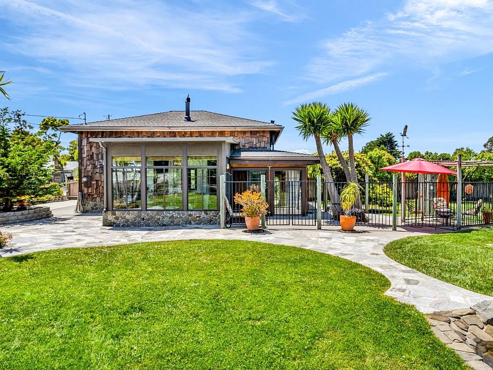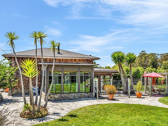 Step into a one of a kind coastal retreat with handcrafted detail and creative design. Set on nearly half an acre west of Hwy 1, this Half Moon Bay gem is surrounded by farms, open space, and mountain views, just a 15 minute walk to the beach. A stone arched entry opens to a warm interior with exposed beams, skylights, and a dramatic suspended fireplace. Sun filled rooms flow to a glass wrapped dining room and patios overlooking lush gardens, a hand crafted waterfall, and entertaining areas. Flexible living includes main level bedrooms, finished upper rooms, and a detached studio with deck, ideal for guests, art, or a home office. A huge detached storage shed and bonus cottage onsite provide additional value and possibilities. Generous parking and room to expand complete the property. Rare in setting, charm, and potential, this is a coastal haven ready for its next chapter.