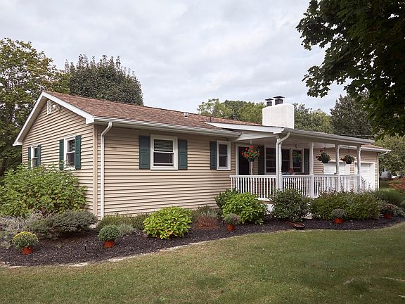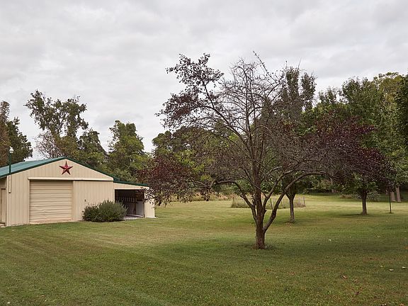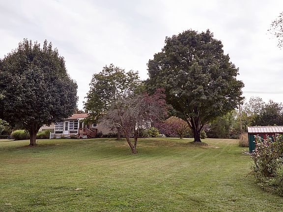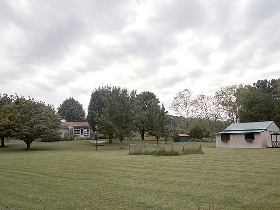 Quiet rural area. Wonderful covered porch (160 sq ft) and sun room (140 sq ft). Wide open area (2+ acres) for garden and pets. Large pole barn w open tractor bay, 2 sheds. Beautiful trees.
