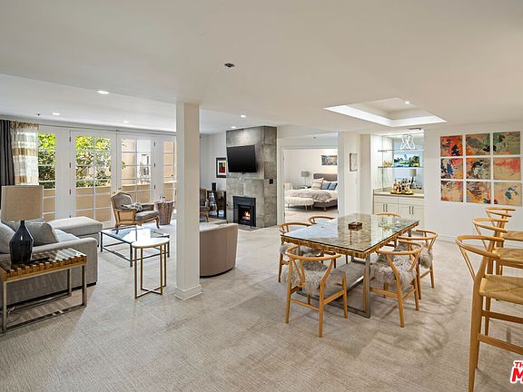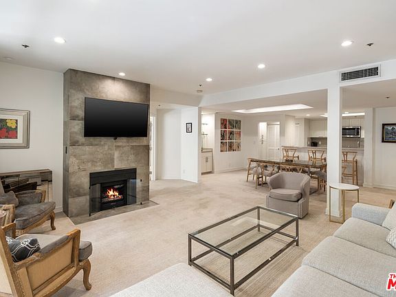 This stunning, remodeled condo blends modern elegance with exceptional functionality. Featuring a chic aesthetic and an ideal open-concept floor plan, the home offers two private bedroom suites positioned on opposite sides of the expansive living, dining, and kitchen areas perfect for comfort and privacy. A welcoming entryway leads to a gourmet kitchen with stone counters and flooring, stainless steel appliances, a breakfast bar, custom cabinetry, and a convenient washer/dryer closet. The bright and airy living and dining area features a fireplace and French doors that open to a private patio, creating a seamless indoor-outdoor flow. The elegant primary suite includes a fireplace, a spacious walk-in closet, french doors to the patio, and a spa-inspired bathroom with double vanities, a custom soaking tub, and a separate shower. The guest suite, located off the entry, features double closets and a modern bath. A beautifully appointed powder room completes the layout. Crafted with high-quality materials and thoughtful design, this home showcases lush custom carpeting and stone flooring, bespoke cabinetry, lighting, and premium tile and stone finishes, including central HVAC. Enjoy the benefits of an amenity-rich complex offering side-by-side parking, storage, guest parking, a fitness center, pool, spa, recreation room, including earthquake insurance